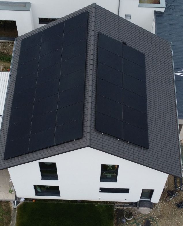 Diese Photovoltaikanlage nutzt den Platz auf der Südseite vollständig aus, um den großen Strombedarf für die Wärmepumpe und das E-Auto abzudecken. Um die Energieerzeugung weiter zu optimieren, wurde die Anlage zusätzlich auf der Nordseite ausgeführt. Mit 36 modernen Full Black Modulen, die jeweils eine Leistung von 460 Wp bieten, sowie einem leistungsstarken Speicher von 14 kWh, sorgt die Anlage dafür, dass das gesamte Haus auch im Falle eines Stromausfalls mit Energie versorgt wird. Die gezielte Ausrichtung der Module maximiert die Effizienz und unterstützt eine nachhaltige Energienutzung.